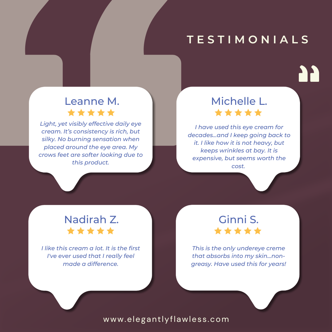 A moisturizing and soothing under eye cream that smooths and brightens the eye area. Visibly reduces the appearance of fine lines and wrinkles. Ideal for use under makeup and with contact lenses.